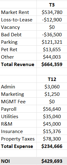 Now, you are looking at T3/T12 property financials and deciding whether you want to make an offer. The financials are the following: