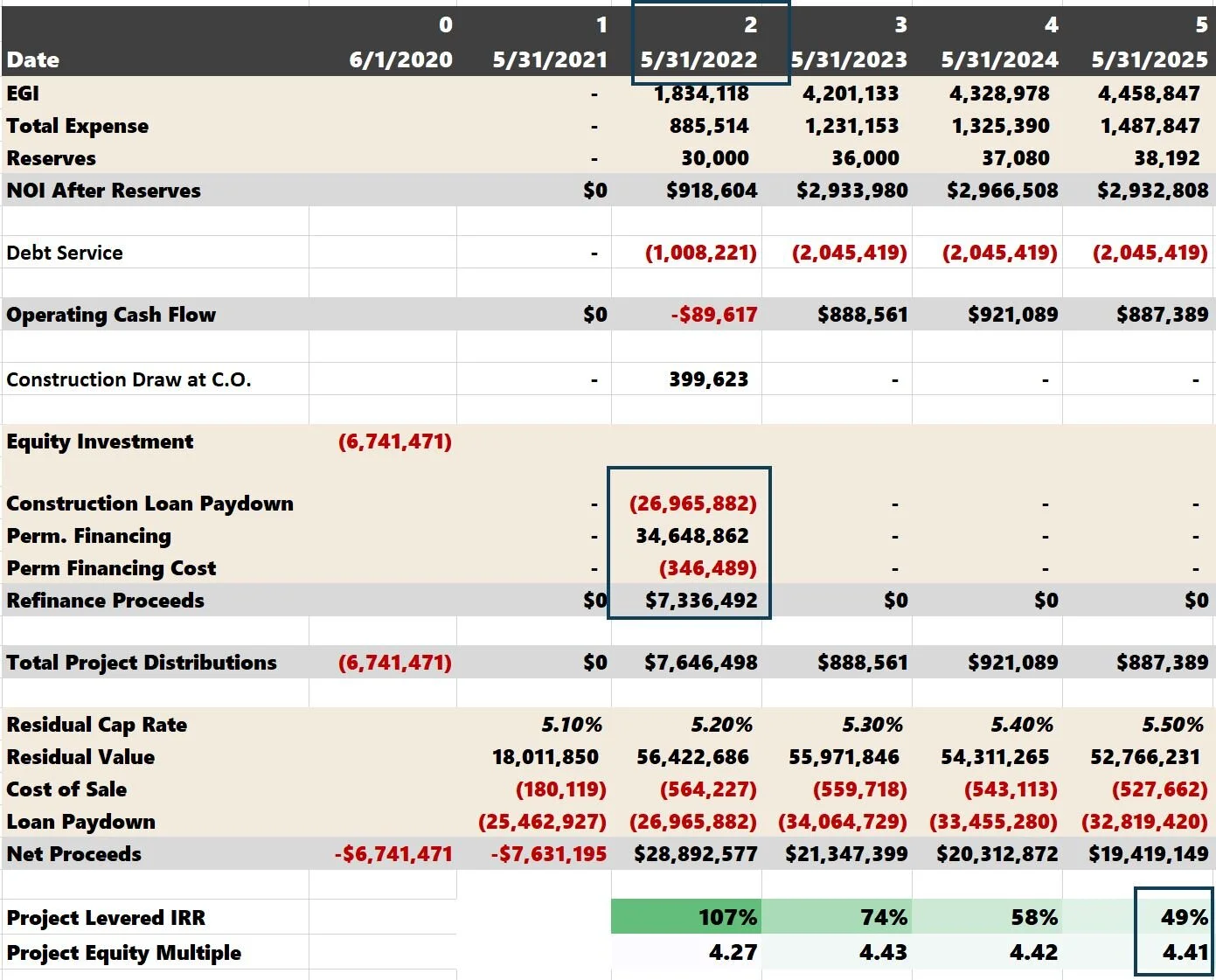 The $0s that come after the -$6,000,000 equity infusion are the construction costs supplemented by both the equity and the construction loan, which effectively net out to $0. The property begins producing marginal income in March 2022 and will sell in May 2022.