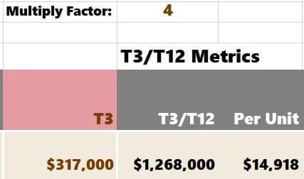 The Trailing Three (T3) Header is tinted pink, so you know to enter only three months of data. You could do a “T6”, a “T2”, or your preferred viewpoint. Just update the header and enter the corresponding months' worth of data. A “multiply factor” cell is above the “T3/T12” column. If you enter “T3,” the model will know to multiply by 4 to annualize the data. If you were going off of a T6, the model would know to multiply by 2.
