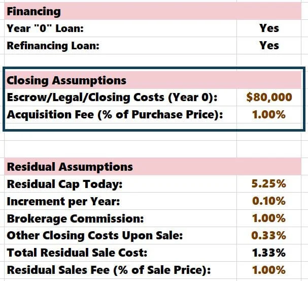 This section hosts arguably the two most essential toggles of the analysis—the purchase price and investment hold period. In real-time, you can see how various pricing metrics are affected by a change in price and hold, most notably the stabilized “Yield on Cost” highlighted in blue (Stabilized NOI / Price + Construction Costs).