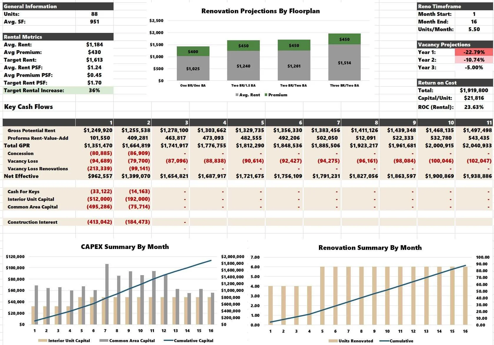 This tab has no assumptions; it is simply an excellent summary of your renovation. It details rental metrics, the renovation timeframe, vacancy projections, return on cost projections, critical cash flows, and a CAPEX summary.