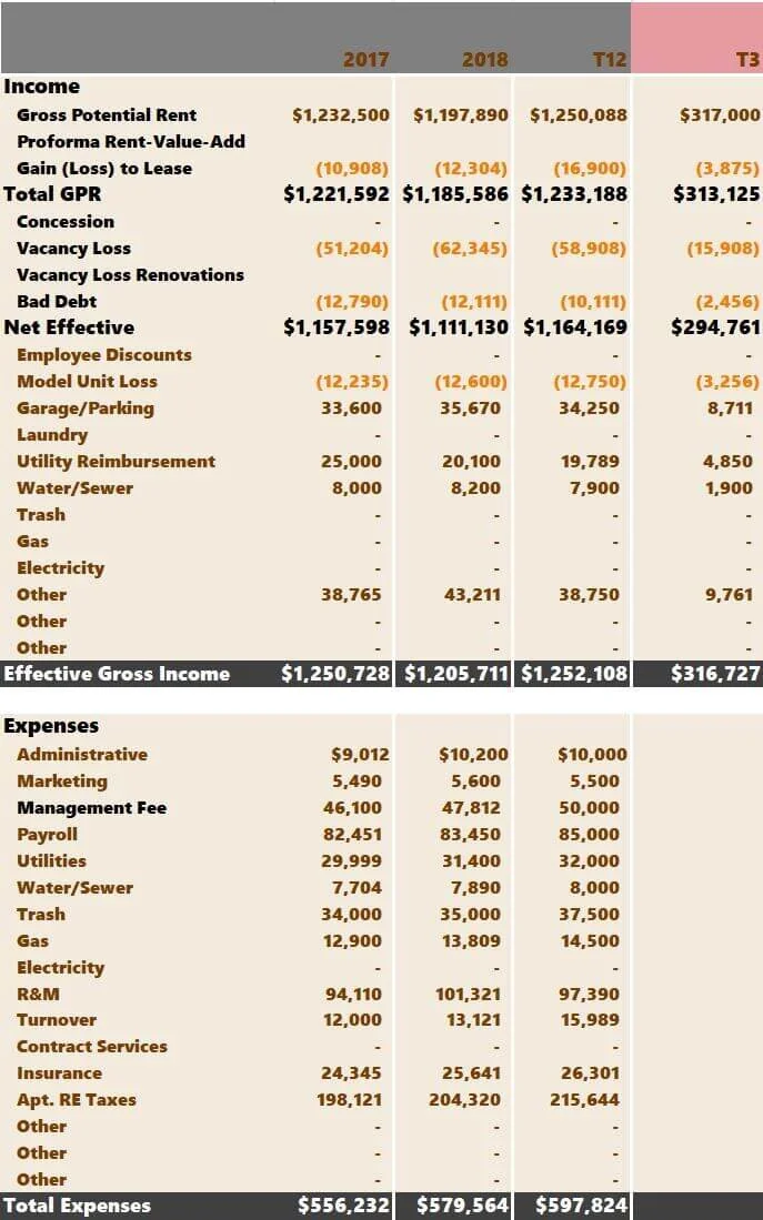 Again, all brown and orange (for the negative numbers) are your responsibility. Hopefully, you were provided the current Trailing 12 Month Financials (T12) broken down monthly and the prior two years of financial information. If this is not the case, you can hide or delete unnecessary columns. For example, if no 2017 operating information were available, I would likely hide that column so it didn't distract me.