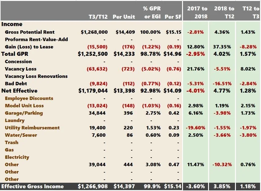 After you key the historical data, you can see the annualized T3/T12 broken down in a few different ways. Many investors love breaking down line items on a "per unit" basis. I am one of them. Looking at revenue items as a % of GPR is helpful. Looking at expense items as a % of EGI is common, especially for Management Fees.