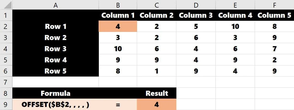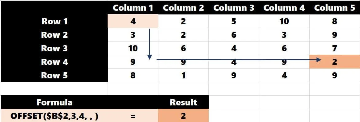 Note: I am using positive numbers for row and column arguments in the above examples. You could also use negative numbers if you want to go “up” and the “left” of the reference cell instead of “down” and to the “right"””