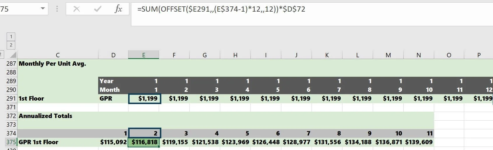 The redevelopment analysis starts at a very granular level, down to the individual units and their monthly rent. I use the =sum(offset()) formulas to take and annualize this monthly data.