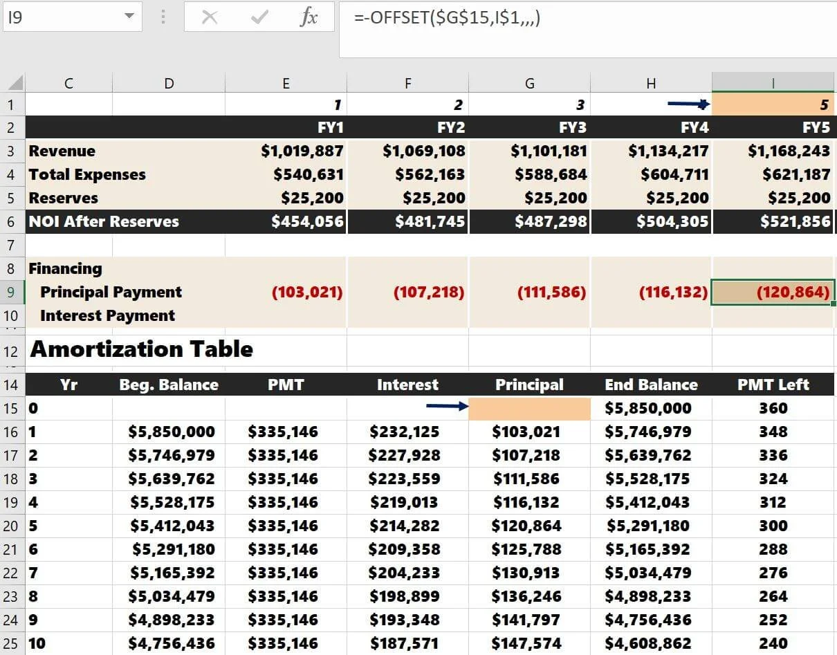 I would drag this formula to the right as I did with the principal payments. Offset is a very efficient formula to look up data on another tab that must be presented differently, like the examples above.