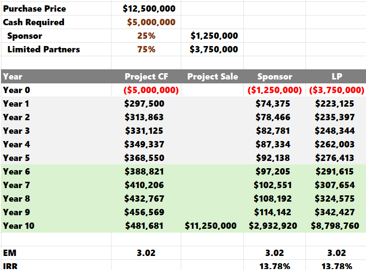 On day one of this arrangement, the sponsor will take an outsized profit interest. In other words, if they put in 10% of the required equity, they would immediately earn a more significant chunk of the distributions (such as 20% ) of the profits (via cash flow, refi, or sale proceeds).