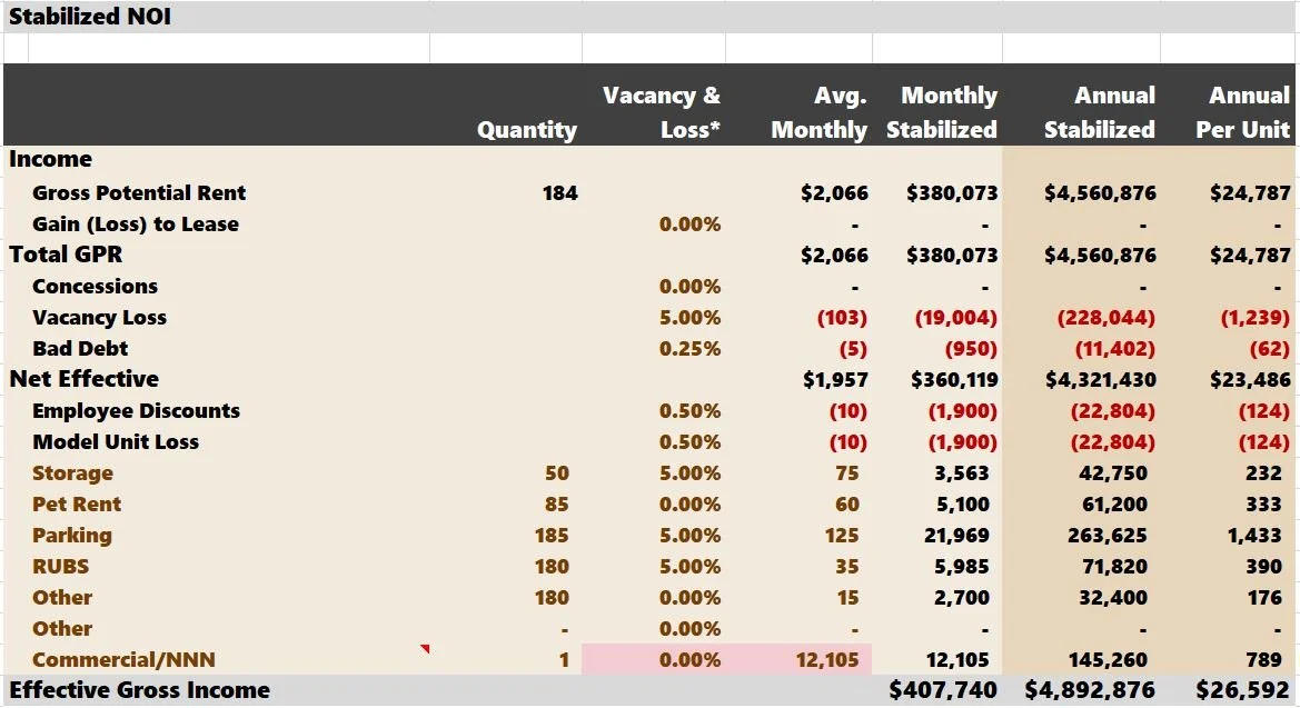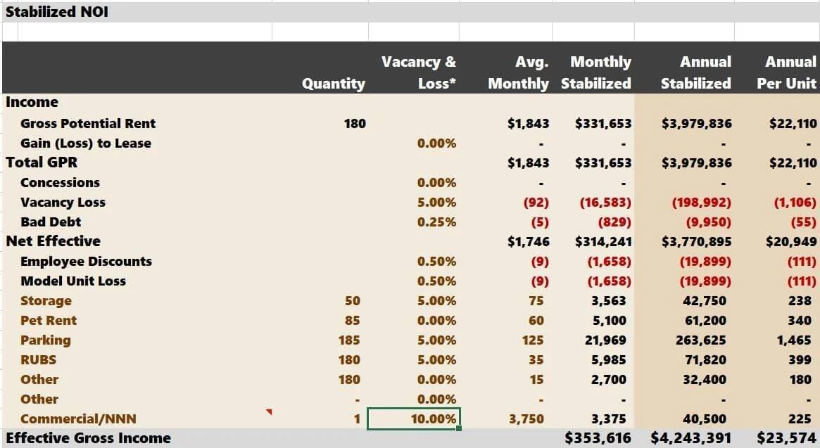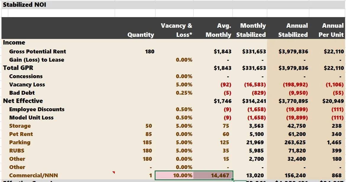 Commercial rent escalators don’t have their dedicated growth assumption year over year. Using the “Unit Mix” method, commercial rent growth is tied to apartment rent growth. If you use the “Other Income” method, commercial rent growth ties to “Other” apartment income increases.