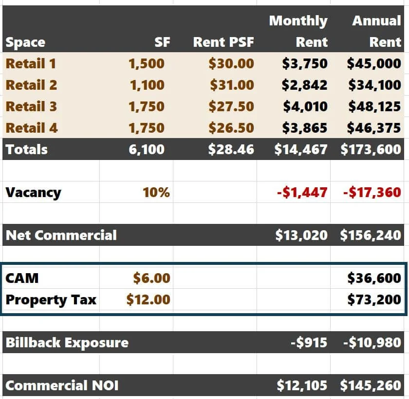 When underwriting commercial rents, it's crucial to consider the total exposure for your retail tenants. The model itself doesn't do a great job of highlighting this. I've seen firsthand how CAM and real estate taxes can negatively affect a small business renting commercial space. Ensure your prospective tenants are equipped to handle all the liability beyond just the rent.