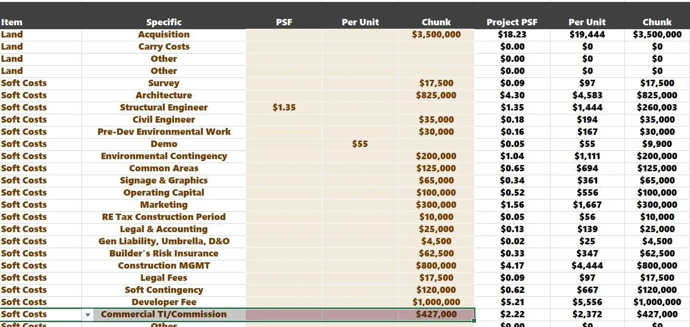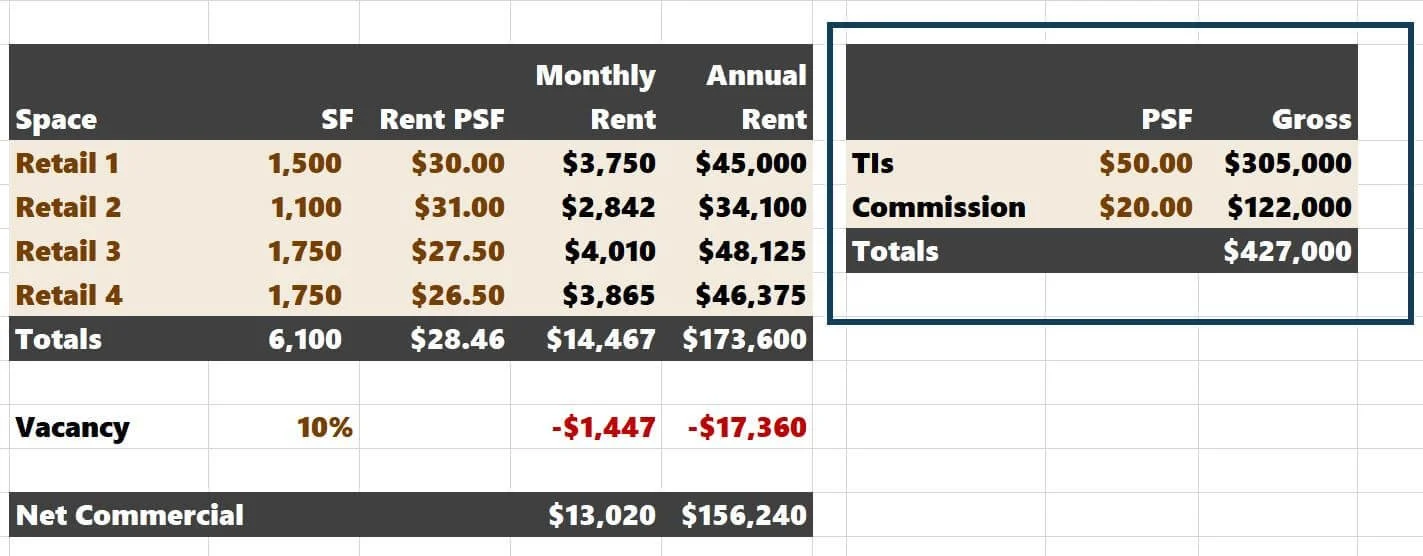 For the last bullet, I'd account for the T.I.s and leasing commissions in the construction budget. If we estimate T.I.s at $50 PSF and leasing commissions at $20 PSF, and our retail S.F. is 6,100: